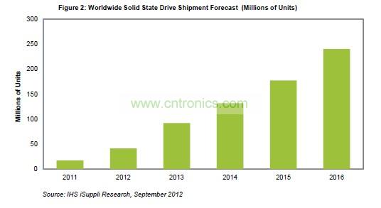 預計2013年SSD出貨量將達到9200萬個,而今年和去年分別是4100萬和1700萬個,如圖所示。明年過后仍將強勁增長,保持兩位數(shù)的速度,直到2016年,屆時預計SSD出貨量將達到2.4億個。