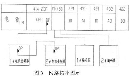 采用PLC 與變頻器控制方法, 實(shí)現(xiàn)多個(gè)分散驅(qū)動(dòng)電機(jī)同步運(yùn)行。PLC 采用西門子S7400 系列, 圖3為網(wǎng)絡(luò)拓?fù)鋱D。
