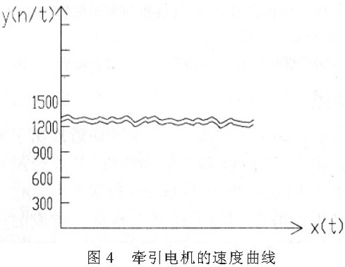利用 STEP7 編制PLC 上位機(jī)監(jiān)控程序,Wincc采集速度值并繪制曲線。數(shù)據(jù)提取的時(shí)間間隔為15ms。實(shí)際上牽引電機(jī)1 和牽引電機(jī)2 速度是相同的, 但為了反映牽引電機(jī)2 的跟蹤和波動(dòng)情況, 在此特地將其分開(kāi), 上面是牽引電機(jī)1 的速度曲線, 下面是牽引電機(jī)2 的速度曲線(見(jiàn)圖4) 。牽引電機(jī)1 的速度發(fā)生變化時(shí), 牽引電機(jī)2 就能及時(shí)地響應(yīng), 進(jìn)行跟蹤, 并且能很快地達(dá)到穩(wěn)定。實(shí)驗(yàn)表明, 采用PLC 和變頻器的控制方法, 能達(dá)到較高的同步要求, 響應(yīng)快、速度波動(dòng)幅度較小。