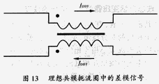 差模電流以相反的方向流過共模扼流圈的繞阻,建立大小相等,極性相反的磁場,它能使輸出相互抵消,見圖13。這就使共模扼流圈對差模信號的阻抗為零。差模信號能不受阻地通過共模扼流圈。