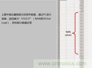 通過PC讀取波形的數(shù)據(jù),超出量程部分將返回”9.91E37”,如下圖所示: