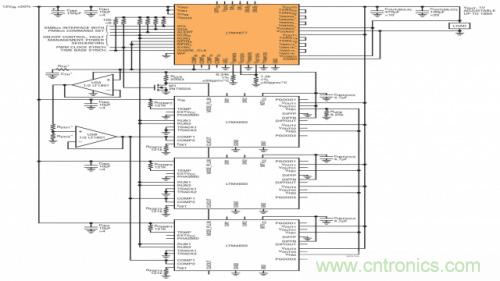 µModule DC/DC 穩(wěn)壓器可提供一種同時(shí)提供高功率輸出和 DPSM 功能的簡(jiǎn)單和有效之方法。由于可容易地通過(guò)并聯(lián)多個(gè) µModule 穩(wěn)壓器以提供高電流輸出 (各個(gè)通道彼此之間的電流匹配準(zhǔn)確度標(biāo)稱值在 1% 以內(nèi)),從而降低了產(chǎn)生熱點(diǎn)的可能性。而且,只有其中一個(gè) µModule 穩(wěn)壓器必需具備 DPSM 能力,原因是即使并聯(lián)的 µModule 未內(nèi)置固有的 DPSM,它也能提供完整的數(shù)字接口。圖 2 示出了一個(gè) LTM4677 (36A DPSM µModule) 與 3 個(gè) LTM4650 (50A µModule) 相并聯(lián)的應(yīng)用電路原理圖。