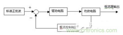 電路組成框圖如圖2所示:這是一個閉環(huán)控制系統(tǒng),電流負反饋電路。標(biāo)準(zhǔn)正弦波產(chǎn)生一個頻率穩(wěn)定、對稱、失真度低的1KHz正弦波信號。驅(qū)動電路把正弦波放大,去推動功放電路,得到正弦交流電流輸出。恒流控制電路從功放輸出中得到的信號,通過與給定的信號相比較,來調(diào)節(jié)驅(qū)動電路的信號,從而使輸出電流保持穩(wěn)定。