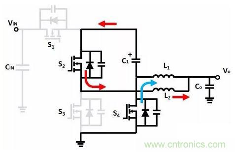L1激磁,輸入電壓通過C1向輸出負載提供能量,同時對C1充電; L2去磁,S4續(xù)流。