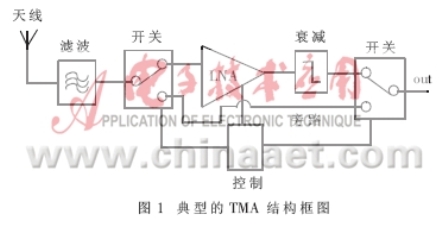 很多情況下,因為基站與移動設(shè)備不平衡連接的緣故,從基站到移動設(shè)備的信號強(qiáng)度和傳輸距離都要超過移動設(shè)備向基站的反向傳輸,并且由于天線與基站間的反饋損耗,使得這種不平衡性變得更大。為了改善這種不平衡性,擴(kuò)大基站接收的覆蓋面,最直接的解決方案是加裝塔裝放大器TMA或Masthead放大器。而TMA中最重要的模塊LNA(如圖1所示)對接收的信號具有選頻功能,并把選頻后的信號進(jìn)行低噪聲放大,使系統(tǒng)靈敏度增強(qiáng),覆蓋半徑增大。