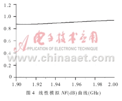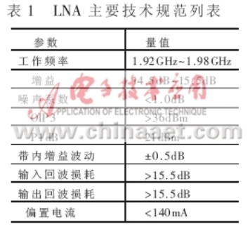 為使圖2中的LNA模塊噪聲系數(shù)。截點(diǎn)和增益達(dá)到表1中的各項指標(biāo),設(shè)計漏極電流Id=60mA?同時,要求單個放大元件在此偏置點(diǎn)的工作性能達(dá)到優(yōu)于表1的規(guī)范值。由于E-pHEMT元件ATF-54143在電流Id=60mA下,具有最佳的截點(diǎn)(IP3)和最小噪聲系數(shù)Fmin;漏源極電壓Vds為3V時,具有稍高的增益;偏置是+5V穩(wěn)定電壓,所需單極性+3V電壓更具有優(yōu)勢,因此選擇其作為放大元件。