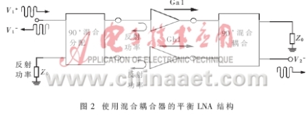 通常,在LNA的設(shè)計中主要考慮低噪聲系數(shù)(NF)。足夠的增益(G)和絕對的穩(wěn)定性?對于本文TMA放大器中LNA設(shè)計的實際技術(shù)規(guī)范要求如表1所示。同時要求所使用的LNA結(jié)構(gòu)滿足良好的輸入輸出匹配,保證LNA的穩(wěn)定性,兼顧到功分/合路網(wǎng)絡(luò)的低損耗、幾何尺寸小,工作帶寬內(nèi)良好的相位和幅度匹配,足夠的工作帶寬(涵蓋在1.95GHz左右),符合CDMA標(biāo)準(zhǔn)上行頻率?據(jù)此選擇了以平衡結(jié)構(gòu)為特征的LNA結(jié)構(gòu)(如圖2)。這種平衡結(jié)構(gòu)的重要特性是:它較單階放大器的截點(diǎn)高出一倍,并以標(biāo)準(zhǔn)50Ω實現(xiàn)輸入輸出匹配,在某一路硬件失效時電路的冗余設(shè)計可保證系統(tǒng)的正常運(yùn)行。但通常增益減少6dB。