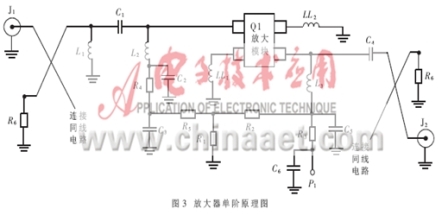 因規(guī)范要求NF最大值只有1dB,為實現(xiàn)放大器的最佳噪聲匹配,網(wǎng)絡(luò)采用高通阻抗匹配。放大電路原理圖如圖3所示,它的輸入匹配網(wǎng)絡(luò)由一個串聯(lián)的電容C1和兩個并聯(lián)的電感L1和L2組成。因電路損耗將直接與噪聲系數(shù)相關(guān),這樣L1和L2的高Q值則變得非常重要。短路電感L1能夠在低頻端提供增益衰減,同時又與C1一起作為輸入匹配阻抗的一部分,C1同時要作為直流隔斷電容。L2還要為pHEMT做偏置電感,在柵極加入電壓偏置,它要求有一個好的旁路電容C2。這個網(wǎng)絡(luò)是對于低噪聲系數(shù)。輸入回波損耗和增益都加以兼顧考慮的方案,電容C2。C4保證帶內(nèi)的穩(wěn)定性,低頻端電阻R3。R4作為阻性終端以保證低頻時系統(tǒng)的穩(wěn)定性。輸出高通匹配網(wǎng)絡(luò)由C4和L3組成,分路電感L3的作用與L2相同,作為pHEMT管偏置載入電感,在漏極偏置。