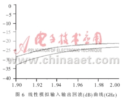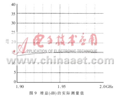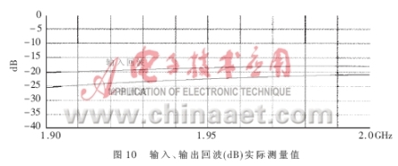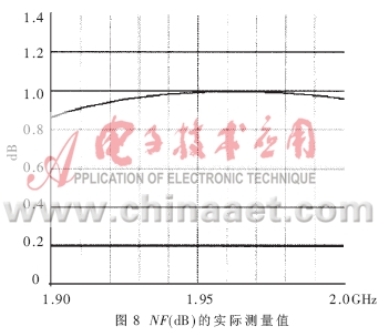 得到了完整的電路PCB板后,就要實際測量電路的各個參數(shù),驗證設(shè)計的仿真結(jié)果是否與之相符,是否最終符合表1的設(shè)計技術(shù)規(guī)范。本文所采用的測試儀器是HP8753ES網(wǎng)絡(luò)分析儀和HP8970B噪聲儀。圖8、圖9表達(dá)出放大器實測的NF和增益曲線,在帶寬為0.1GHz的頻率范圍內(nèi)NF的值在0.8dB和1.0dB之間,增益在1.97GHz達(dá)到最大值15.5dB,在1.99GHz達(dá)到了15.3dB。由于NF是在實際PCB板外腔體內(nèi)測得的,包含了同軸連接器的損耗和二級噪聲損耗,其測量指標(biāo)表明實際的電路NF特性要稍差于模擬特性。圖10是輸入、輸出的回波曲線。當(dāng)頻點(diǎn)在1.96GHz時,輸入回波為18dB,輸出回波達(dá)到22.5dB,放大器的OIP3在直流偏置Vds=3V,Id=60mA時測得值為37dBm,P1dB為21.4dBm。電路在較低的偏置狀態(tài)下Vds=3V,Id=40mA放大器的NF和增益都沒有降低,只有OIP3測出下降為36.5dBm。