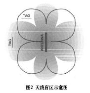 由于環(huán)形天線的電磁場在其臨近區(qū)域分布不均勻,因此會出現(xiàn)讀寫盲區(qū)。如圖2中黑線勾勒出的范圍之外區(qū)域一般為單個天線的讀寫盲區(qū)。經(jīng)反復實驗證明將電子標簽擺放位置轉到與最佳位置成40°角區(qū)域時,一般可正常讀寫操作。