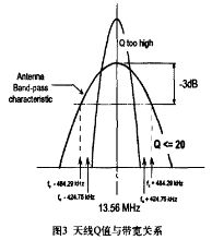 由式(2)可看出,天線的傳輸帶寬B與品質(zhì)因數(shù)Q成反比。因此,過高的品質(zhì)因數(shù)將導致帶寬縮小,降低讀寫器的調(diào)制邊帶信號幅度,導致讀寫器無法與標簽通信。天線Q值與3 dB帶寬的關系曲線如圖3所示。由圖3可看出:環(huán)形天線與50 Ω的負載相連時,其Q值最好不超過30。為了優(yōu)化天線的性能。讀寫器匹配電路的駐波比應小于1:1.2。