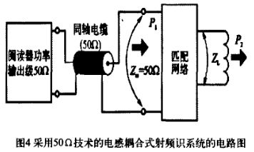 本文研究的RFID讀寫器頻率為13.56 MHz,為有效抑制功率反射、寄生輻射等高頻效應,通常是將讀寫器天線通過同軸電纜連接到讀寫器的高頻模塊,同軸電纜阻抗為50 Ω。因此,天線的阻抗匹配就是通過一定的無源匹配電路來改變讀寫器天線的輸入阻抗,使其與同軸電纜的阻抗保持一致,這樣就可使能量通過同軸電纜幾乎無損失的從讀寫器傳送出去。圖4為采用50 Ω技術的電感耦合式射頻識別系統(tǒng)電路。