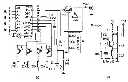 該部分電路主要由315MHz無(wú)線數(shù)據(jù)發(fā)射模塊和編碼集成PT2262組成。該無(wú)線發(fā)射模塊原理圖如圖1中(b)所示,它具有較寬的工作電壓范圍3-12V,當(dāng)電壓變化時(shí)發(fā)射頻率基本不變,和發(fā)射模塊配套的接收模塊無(wú)需任何調(diào)整就能穩(wěn)定地接收。當(dāng)發(fā)射電壓為3V時(shí),空曠地傳輸距離約20-50m,發(fā)射功率較??;當(dāng)電壓5V時(shí)約100-200m)當(dāng)電壓9V時(shí)約300-500m;當(dāng)發(fā)射電壓為12V時(shí),為最佳工作電壓,具有較好的發(fā)射效果,發(fā)射電流約60毫安,空曠地傳輸距離700-800m,發(fā)射功率約500mW.當(dāng)電壓大于12V時(shí)功耗增大,有效發(fā)射功率不再明顯提高。發(fā)射模塊采用ASK方式調(diào)制,以降低功耗。當(dāng)數(shù)據(jù)信號(hào)停止時(shí)發(fā)射電流降為零,數(shù)據(jù)信號(hào)與DF發(fā)射模塊輸入端可以用電阻或者直接連接而不能用電容耦合,否則DF發(fā)射模塊將不能正常工作。數(shù)據(jù)電平應(yīng)接近DF數(shù)據(jù)模塊的實(shí)際工作電壓,以獲得較高的調(diào)制效果。