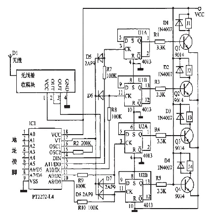 該部分電路主要由315MHz無(wú)線數(shù)據(jù)接收模塊、解碼集成PT2272,D觸發(fā)器4013和繼電器電路組成。