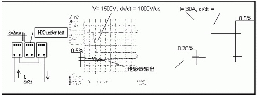 對(duì)階躍電流的超快速響應(yīng)時(shí)間對(duì)IGBT短路保護(hù)必不可少。HX系列可以以50A/ms以上的速度,準(zhǔn)確追蹤電流變化,對(duì)階躍電流的響應(yīng)最快為3ms。