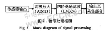 前端信號(hào)處理電路由儀表放大器、四階巴特沃思低通濾波器等部分構(gòu)成,其基本框圖如圖2所示。